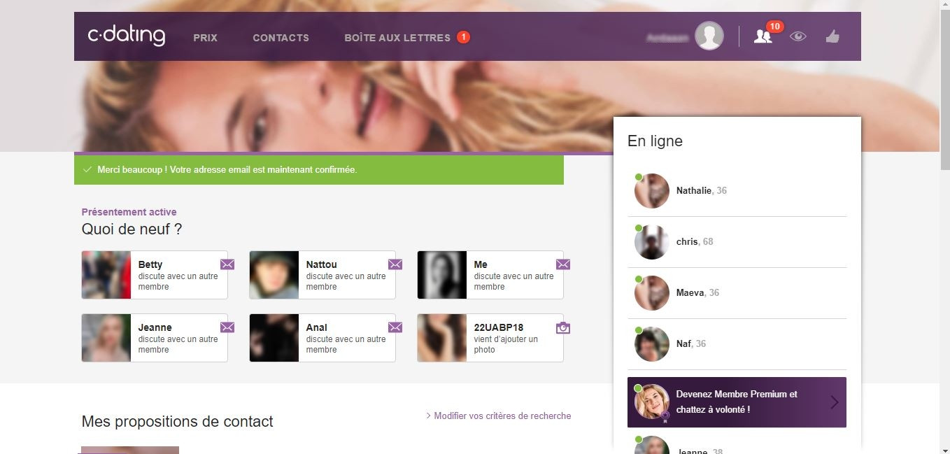 Je suis très satisfaite de mon expérience sur Cdate. Je n'ai pas renouvelé mon abonnement car c'est quand même un peu cher pour moi, mais en 3 moi j'ai déjà pu rencontrer pas mal d'hommes. D'ailleurs je suis toujours en contact avec certains d'entre eux.
